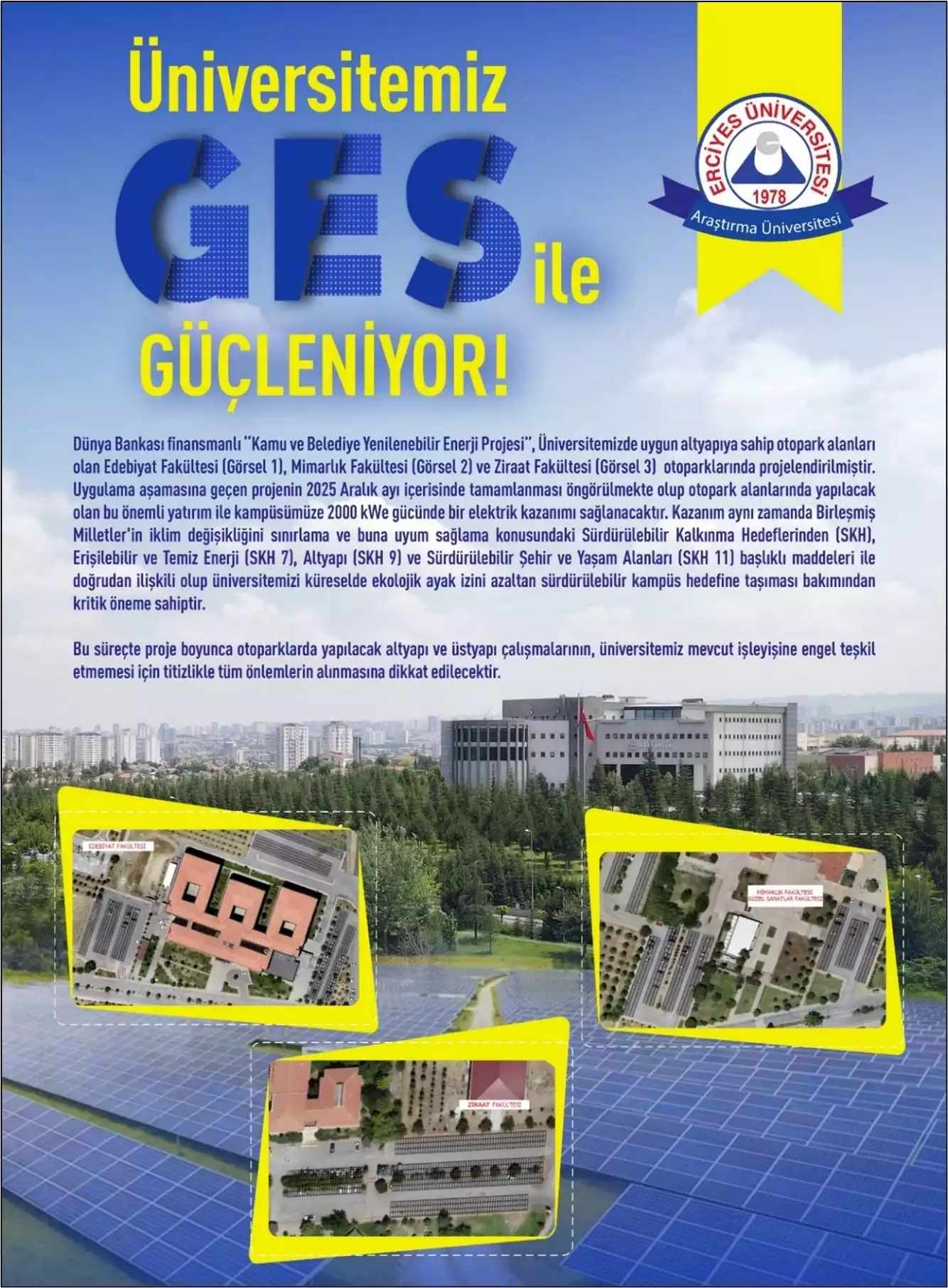Renewable energy production studies are being carried out on campus. There are solar panels at various points around the campus. Our university actively uses solar energy, a sustainable and environmentally friendly energy source.